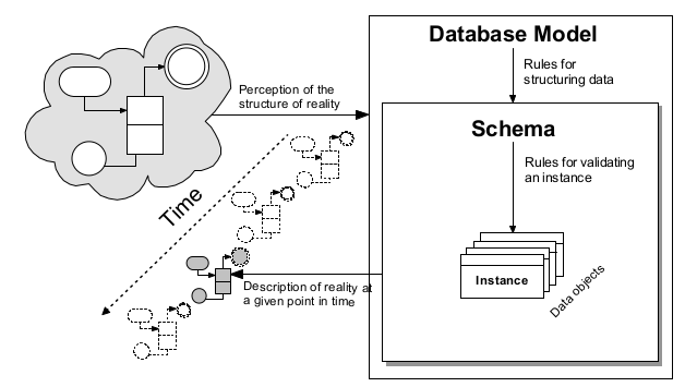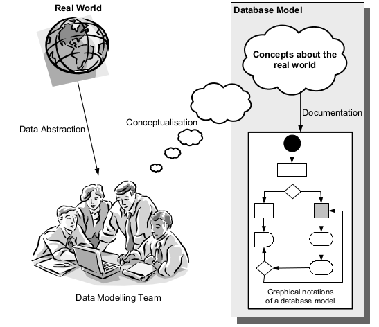 - Database - people translate that conceptual understanding into means for data structuring and storage
