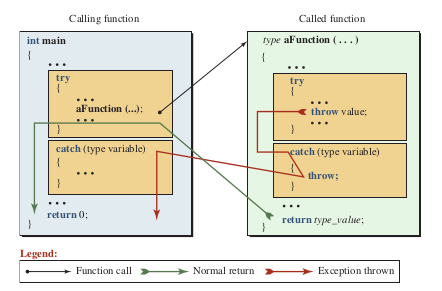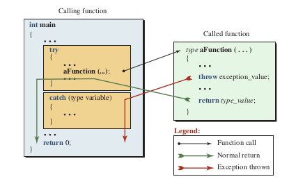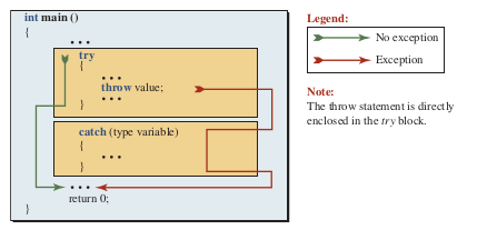 The try-catch block is still in main, but the exception is thrown in another function that is called in the try clause. The throw statement in this case is in the called function