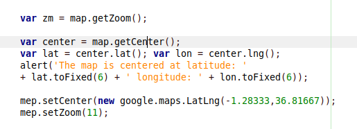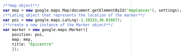 google.maps.Map object, which represents the map itselfgoogle.maps.LatLng object, which represents locations on the mapgoogle.maps.LatLngBounds object, which represents the bounds of a rectangular area on the mapgoogle.maps.Marker object, which represents the markers you use to visually identify features on the mapgoogle.maps.InfoWindow object, which is a window you use to display information about the selected markergoogle.maps.event object, which is an auxiliary object for handling all map related eventsThis object represents the map and it's the most important object of the API