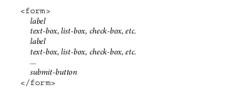 document.getElementById(id).innerHTML - changes contents of a given elementdocument.write() - write directly to the HTML output contentdocument.getElementById(id).attribute - changes the value of the src attribute of a given elementdocument.getElementById(id).outerHTML - changes contents of the entire elementdocument in your code and then use the root object as a starting point in traversing down the treeinteracted with (e.g. a button that was clicked) and use that node object as a starting point in traversing up or down the treedocument object's getElementById method with the element's id value as an argumentA form is a mechanism for grouping input controls (e.g., buttons, text controls, and checkboxes) within a web page